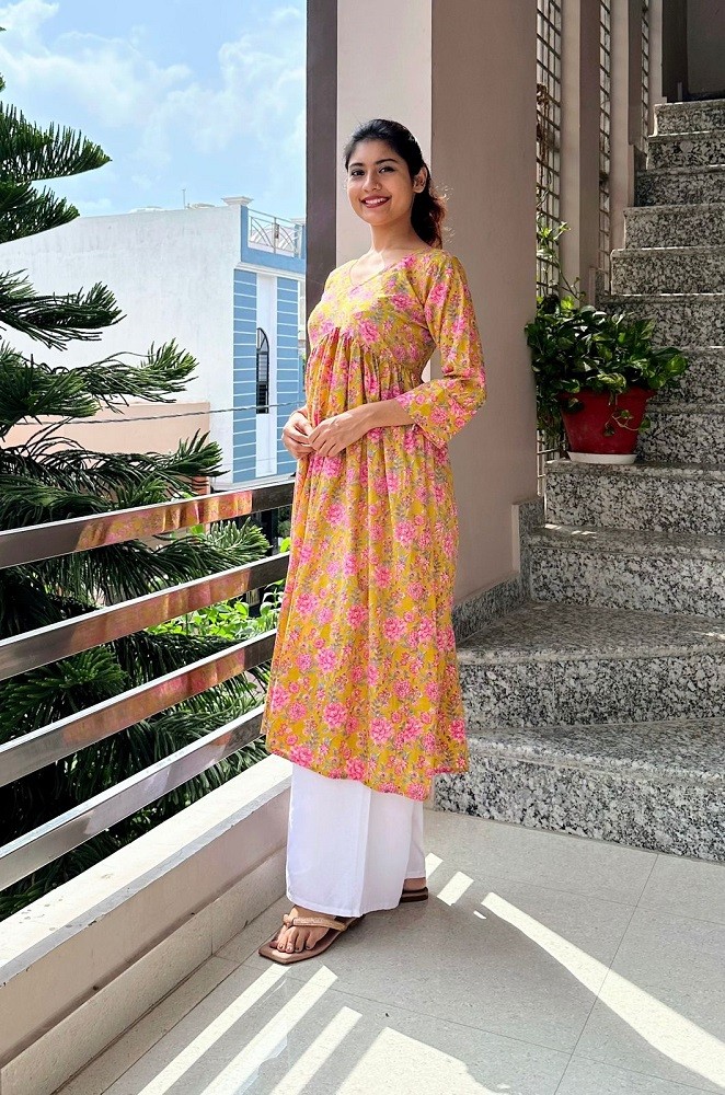 COLOUR : YELLOW WITH PINK FLOWERS
